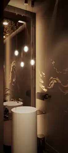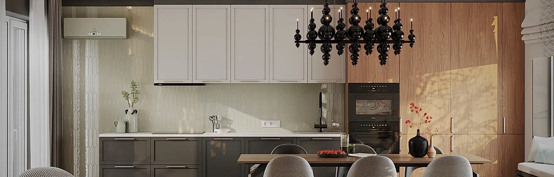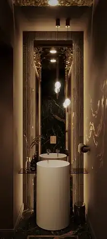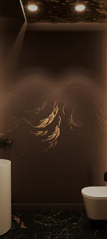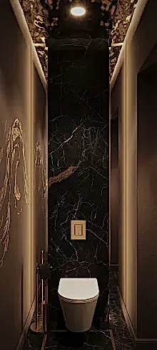 Гостиную и прихожую необходимо было сделать светлыми, поскольку окна выходят на северную сторону, а кухня наоборот стала более контрастной. Особое пожелание было и по санузлу — заказчик попросил сделать роскошный, темный санузел, чтобы у гостей создавалось впечатление, будто они находятся в уборной дорогого ресторана.